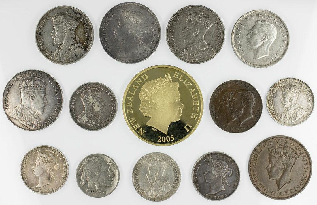 Canada, Victoria (1837-1901), 25 Cents, 1872 H; 1883 H, milled edges (KM 5), near very fine; George V (1910-1936), 50 Cents, 1910, milled edge (KM 12), near very fine; 25 Cents, 1910; 1928; 1929, milled edges (KM 11a; 24a); Confederation of Canada, Diamond Jubilee, AE Medal, 1927, unsigned, very fine; New Zealand, George V (1910-1936), Florin, 1933; 1934, milled edges (KM 4), very fine; George VI (1936-1952), Florin, 1942, milled edge (KM 10), very fine; Elizabeth II (1952-2022), Aluminium-Bronze Dollar, 2005, milled edge, 20g (KM 276), two small staining marks to the obverse, otherwise as struck; USA, Five Cents, 1937 D, plain edge (KM 134), fine; British Honduras, Victoria (1837-1901), 50 Cents, 1894, milled edge (KM 10), very fine; Jersey, George VI (1936-1952), One Twelfth Shilling, 1947, plain edge (Spink 7017), traces of mint red, extremely fine (14)