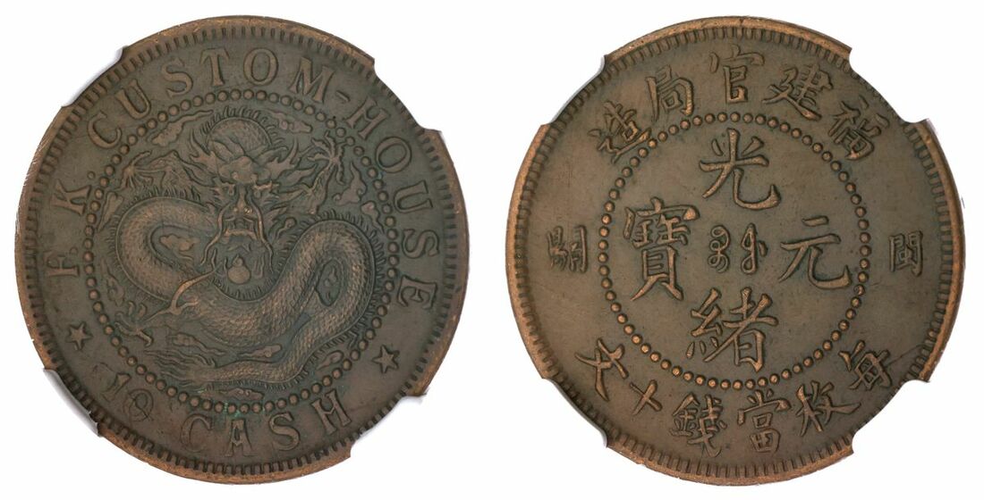 NGC AU55 BN | China, Fukien, Kuang-hsü (1875-1908), 'Custom House' Type, 10 Cash, 1901-1905, Chinese characters, small characters rev. F. K. CUSTOM HOUSE * 10 CASH *, flying Imperial dragon facing, plain edge, 12h (KM Y97.1; CL FK.18), faintest of hairline die flaws in the legends and with a glossy appearance to dark brown surfaces, good very fine example of this scarcer small character type, in NGC holder, graded AU55 BN (Cert. #2824994-031)
