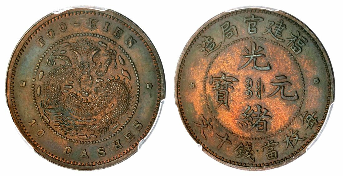 China, Fukien, Kuang-hsü (1875-1908), 10 Cash, 1901-1905, Chinese characters, rev. flying Imperial Dragon facing, plain edge, 12h (CL FK.09; KM Y100.3), previously wiped, nevertheless now with areas of mint red to otherwise uniformly brown surfaces, extremely fine, in PCGS holder, graded AU DETAIL, CLEANED (Cert. #776754.92)