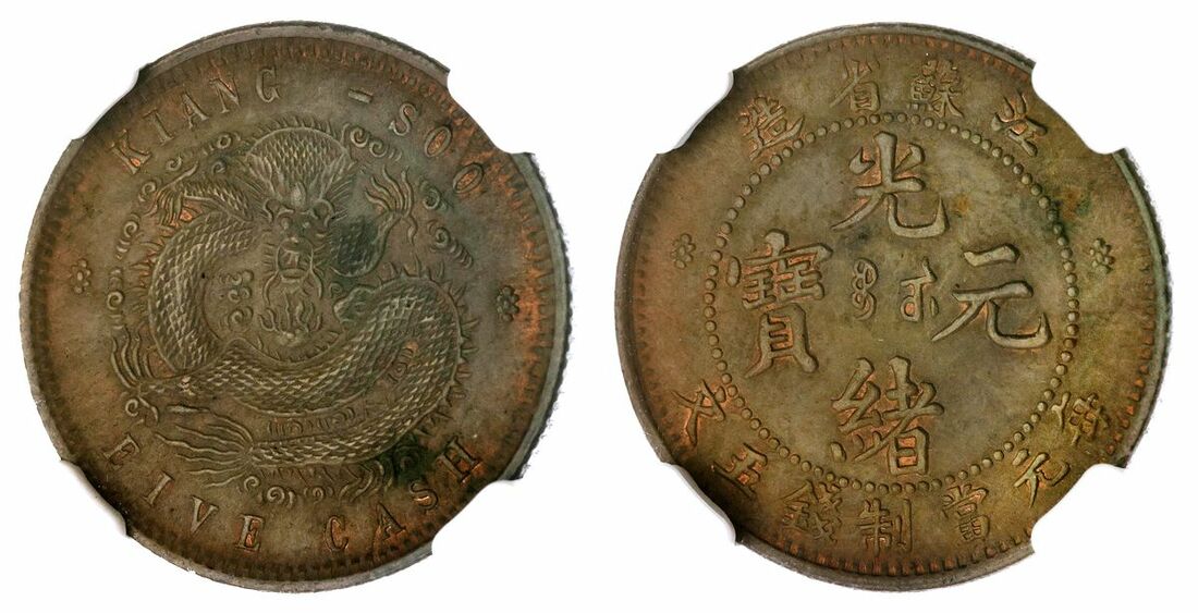 NGC MS62 | China, Kiangsu-Kiangsoo, Kuang-hsü (1875-1908), 5 Cash, 1901, Chinese characters, rev. flying Imperial dragon facing, milled edge, (KM Y158), glimmers of original mint red to the edges of devices, otherwise with uniformly brown surfaces, pleasing extremely fine, in NGC holder, graded MS62 BN (Cert. #3501419-027)