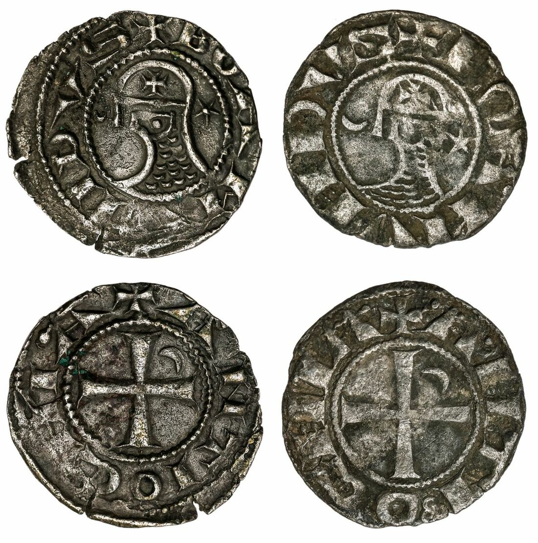 (x) The Leja Park Collection | Crusaders, Bohemund III (1163-1201), 'Helmet' Type, Denier, Antioch, helmeted bust left, rev. + ANTIOCHIA, short cross, crescent in angle, 0.99g, 11h (Metcalf 125ff), off-centre, yet a bold strike, good very fine; another, similar, 0.78g, 1h (Metcalf 125ff), lightly rubbed, fair to fine (2)