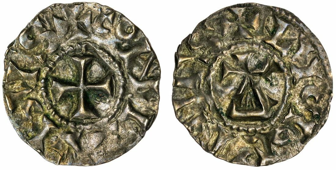 (x) The Leja Park Collection | France, Carolingian, Conrad le Pacific (937-993), Denier, Lyon, + CONRADVS, cross pattée, rev. + LVGDVNVS, cross on church tower, 1.02g, 5h (Depeyrot 531; MG 1683; Prou 634), crimped and soft in parts, otherwise with an old cabinet tone, very fine