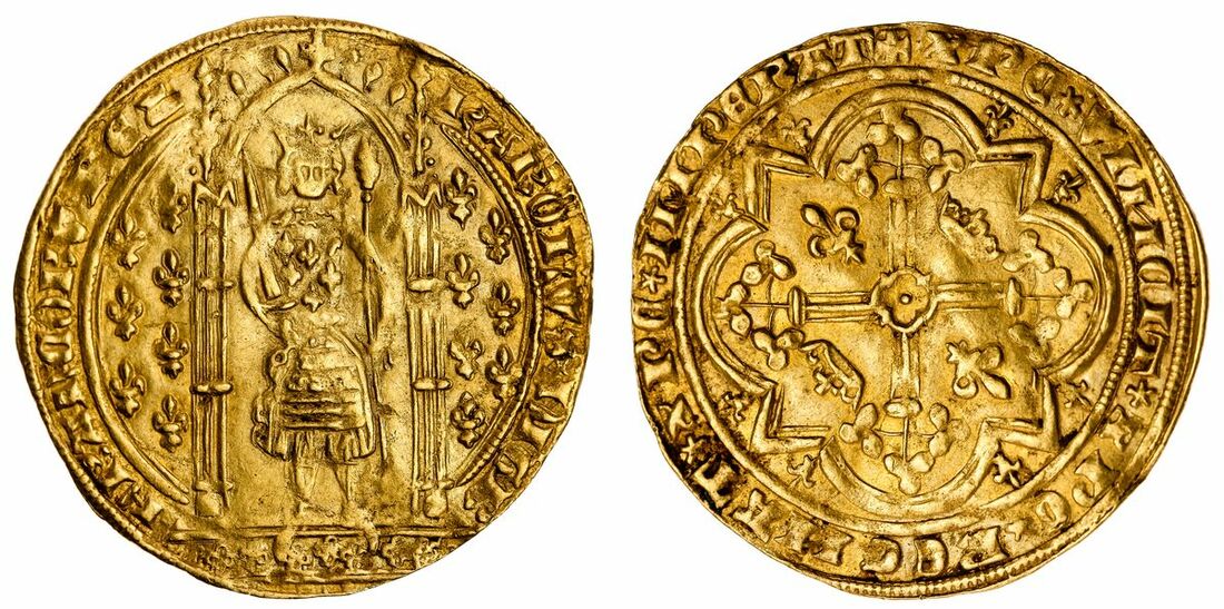 France (Royale), Charles V (1364-1380), Gold Franc-a-Pied, 2nd Emission, 1388, King standing facing, rev. cross fleury inside voided quadrilobe, 3.78g, 7h, m.m. cross (Duplessy 360; Fb. 284), creased and crimped, otherwise lustrous, about very fine