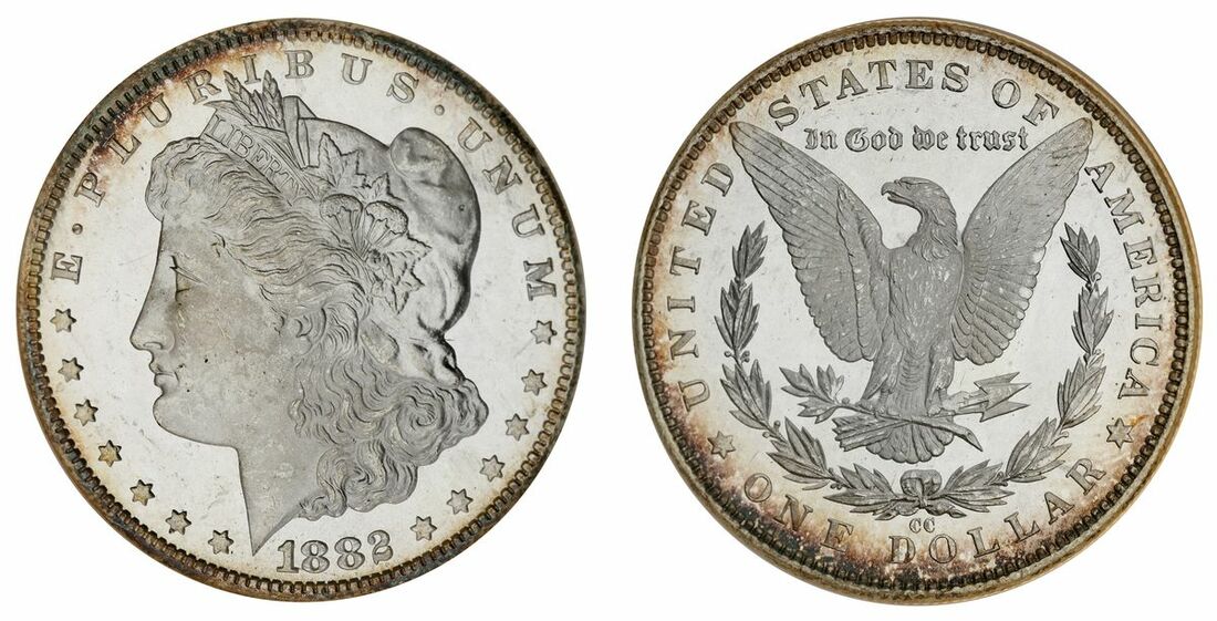 NGC MS65 DPL | USA, 'Morgan' Dollar, 1882 CC, Carson City, Liberty head left, rev. eagle, milled edge, 6h, (KM 110), friction marked, otherwise with a full mint-bloom and toned to the peripheries, handsome extremely fine in NGC holder, graded MS63 DPL (Cert. #196216-003)