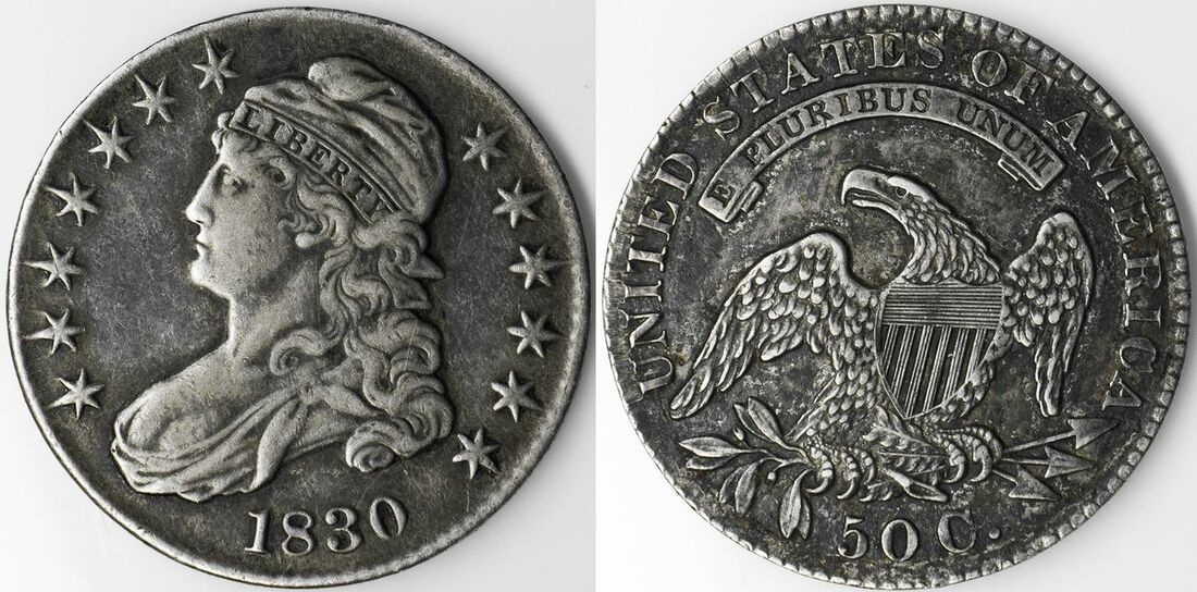 USA, 'Capped Bust' Half-Dollar, 1830, bust of Liberty left, seven stars in front, six stars behind, by John Reich, rev. American Bald Eagle, wings spread, bundle of arrows and olive branch in its claws, scroll above reads 'E PLURIBUS UNUM', edge lettered, 13.26g, 6h (KM 37), pleasing dark toning, slight softening around the edges and wear to higher points but otherwise very fine