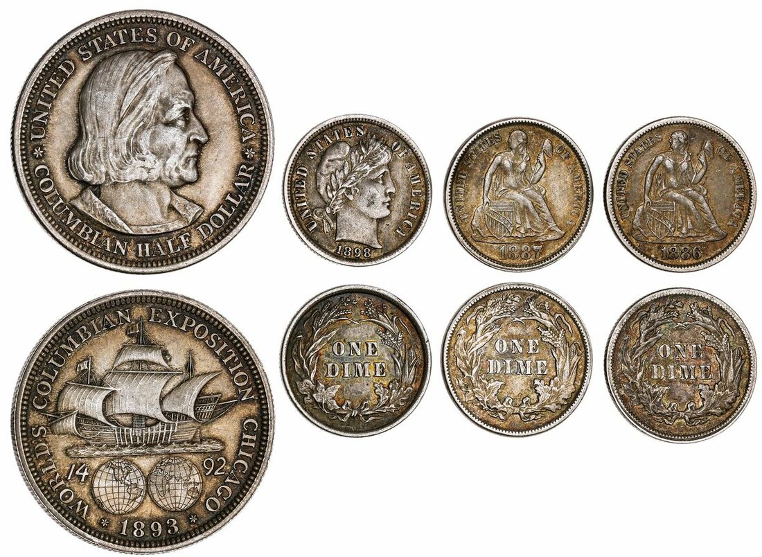 USA, 'Columbian Exposition' Half-Dollar, 1893, Philadelphia, bust right, rev. ship Santa Maria sailing left above two planispheres, milled edge, 12.48g, 6h (KM 117); also 'Seated Liberty' Dime, 1886; 1887, milled edges, 6h, 2.46g; 6h, 2.50g (KM A92); finally, 'Barber Dime', 1898, milled edge, 2.51g, 6h (KM 113), all toned, fine to very fine (4)