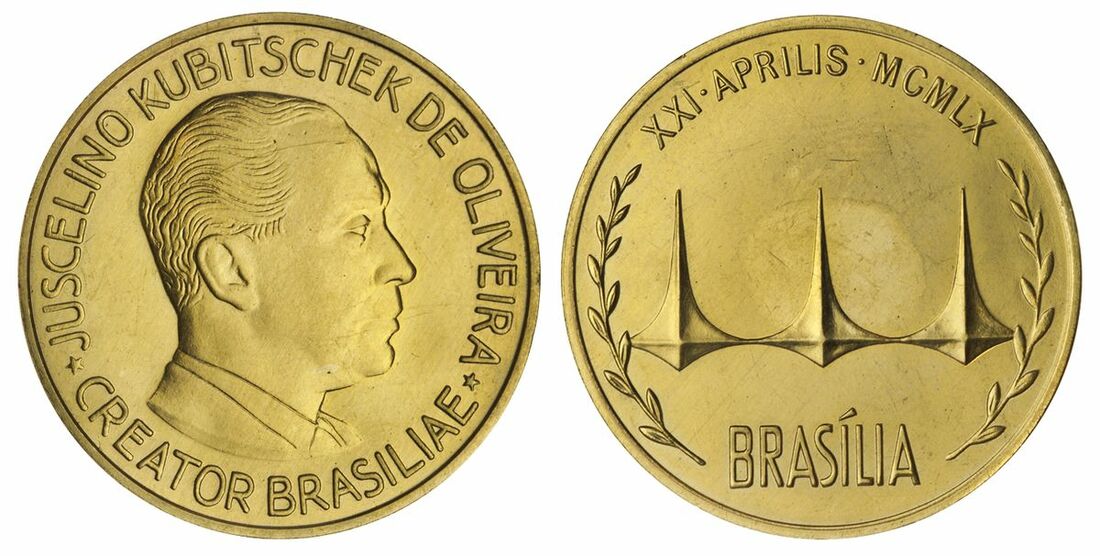 Brazil, Juscelino Kubitschek de Oliveira, 'Creation of Brasilia', Commemorative Gold Medal, 1960, unsigned, bare head of President right, rev. three towers, XXI APRILIS MCMLX above, BRASILIA below, flanked by wreaths, edge stamped: 22:24 - 15.97GM., 16.02g, 12h, 28mm, faint surface marks, otherwise brilliant uncirculated