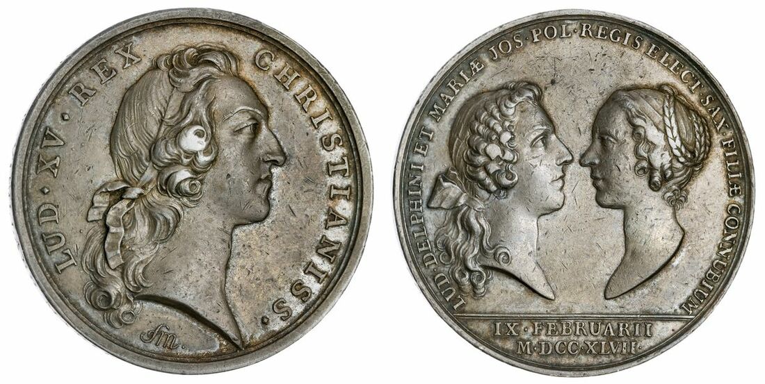 (x) France, Marriage of the Dauphin to Marie Therese of Spain, AR Medal, 1747, by F. Marteau, LUD · XV · REX CHRISTIANISS ·, bust right, rev. LUD · DELPHINI ET MARIAE JOS · POL · REGIS ELECT · SAX · FILLAE CONNUBIUM, busts vis-à-vis, IX · FEBRUARII M · DCC · XLVII · in exergue in two lines, 41mm, 31.93g, lightly bagmarked yet with some toning to dark surfaces, bolder very fine