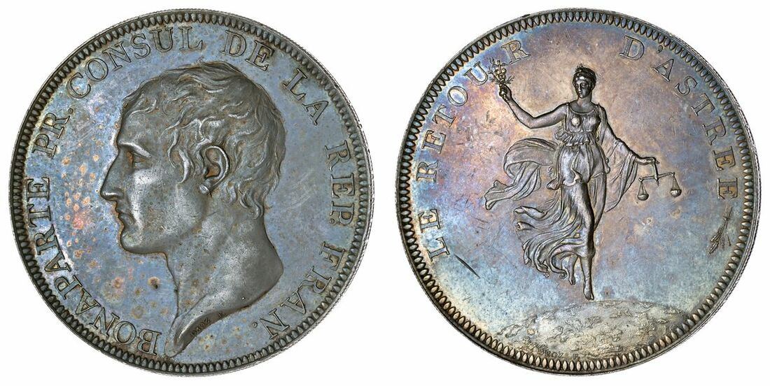 (x) France, Peace of Amiens, AR Medal, 1802, by Droz, BONAPARTE PR. CONSUL DE LA REP. FRAN., bust left, rev. LE RETOUR D'ASTREE, Astraea advancing over the globe, holding caduceus and scales, PAIX GENERALE A AMIENS AN DIX MDCCCII on edge, 36.69g, 40mm (Bramsen 199; Julius 1056; Essling 959), some hairlines to the reverse, otherwise with a most pleasing and striking tone in hues of blue and ochre, fully lustrous, extremely fine