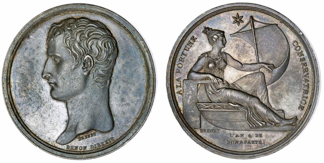 (x) France, Napoléon's Escape from the Rue Saint-Nicaise Assassination Plot, AR Medal, 1802, by N. Brenet, bust left, rev. A LA FORTUNE CONSERVATRICE, Fortune seated to right in boat with rudder and sail, star above, L'AN 4 DE BONAPARTE. in two lines in exergue, 34mm, 18.86g (Bramsen 275), the faintest of contact marking to the fields and some deposits in recesses, otherwise with a glossy lustre and cabinet tone, a most handsome design, extremely fine