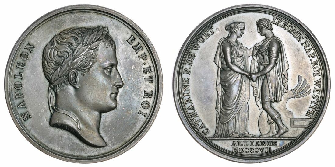 (x) France, Wedding of Jérôme-Napoléon Bonaparte and Catherine de Würtemberg, AR Medal, 1807, by Andrieu, NAPOLEON EMP · ET ROI, laureate bust right, rev. CATHARINE P . DE WURT. IEROME NAP. ROI WESTPH, female and male figures in Roman dress, stand vis-à-vis, holding hands, puppis of ship behind, ALLIANCE MDCCCVII in exergue in two lines, 46mn, 46.14g (Bramsen 664), some light contact marks, otherwise with a pleasing dark grey tone and lustre, extremely fine