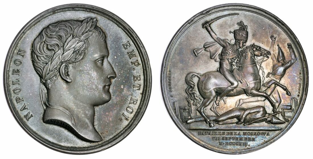 (x) France, Battle of Moscow, AR Medal, 1812, by Andrieu and Jeuffroy, NAPOLEON EMP. ET ROI., laureate bust right, rev. French Hussar on horseback riding right, raising sword and trampling two fleeing Russian soldiers, 42mm, 37.16g (Bramsen 1162; Julius 2528), small die flaw to the reverse edge at 11 o'clock, otherwise with a dark cabinet tone in hues of blue and ochre, highly lustrous, extremely fine