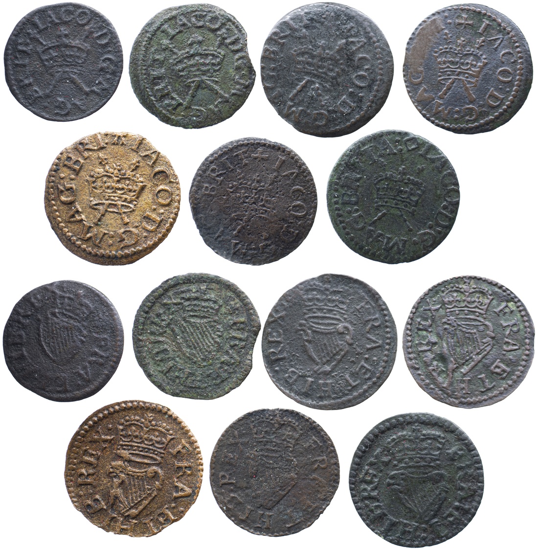 James I (1603-1625), Harington Farthing, Type 2, normal size, m.m lys, 0.41g, 6h (Spink 2676), good fine; another, m.m cinquefoil, 0.50g, 6h (Spink 2676), very fine; and Lennox Farthing, Type 2, m.m flower, 0.47g, 6h (Spink 2678), struck from rusted dies, about very fine; and Type 3, m.m cross fourchee, 0.41g, 12h (Spink 2679), soft to part of legend, about very fine; and Type 3, m.m cross fourchee, 0.38g, 12h (Spink 2679), lightly pitted, good fine; and Type 4, with five strings to harp, m.m A, 0.49g, 6h (Spink 2680), good very fine; and Type 3, contemporary counterfeit, m.m mascle, 0.62g, 6h (Spink 2679A), about very fine (7)