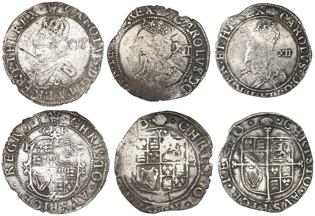 Charles I (1625-1649), Group C, Type 2a, Shilling, Tower (under King), 1630-1631, third crowned and draped bust left, value behind, rev oval garnished shield, CR above, 9h, 5.78g, m.m plume (Brooker 450; North 2221; Spink 2787), cleaned and lightly porous surfaces, scratched, nonetheless the portrait mostly pleasing, very fine; Group E, Type 4.2, Shilling, Tower (under King), 1636-1638, fifth 'Aberystwyth' crowned bust left, wearing falling lace collar, with double-arched crown and rounded shoulders, small value behind, rev. square-topped shield over cross moline, 3h, 5.87g, m.m tun (Brooker 513-514; North 2227; Spink 2794), scratched and lightly bent to pitted surfaces, fine / very fine; Group F, Type 4.4, Shilling, Tower (under Parliament), 1645, sixth large 'Briot's' crowned bust left, wearing falling lace collar, value behind, rev. square-topped shield over cross moline, 7h, 6.75g, m.m eye (Brooker 556-559; North 2232; Spink 2800), ragged to the edges, mostly flat to the portrait, fine (3)