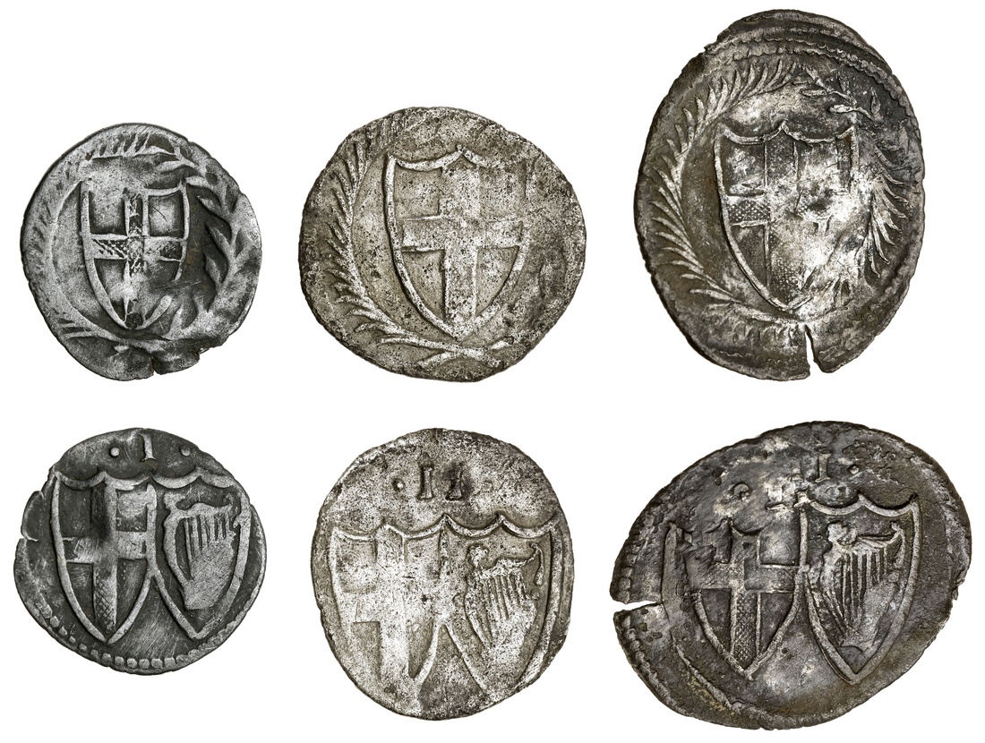 A Trio of Commonwealth Silver (1649-1660), Halfgroat, shield of England bearing the cross of St. George within wreath, rev. conjoined shields of England and Ireland below denomination in Roman numerals, 0.87g, 10h (North 2728; ESC 2160; Spink 3221), on an oval and slightly concave flan, small split to edge, nonetheless pleasing to the struck details, very fine; Halfgroat, as before, 0.85g, 2h, short of flan and porous, fine; Penny, as before, 0.44g, 9h (Spink 3222), lightly crimped to dark surfaces, bolder fine (3)