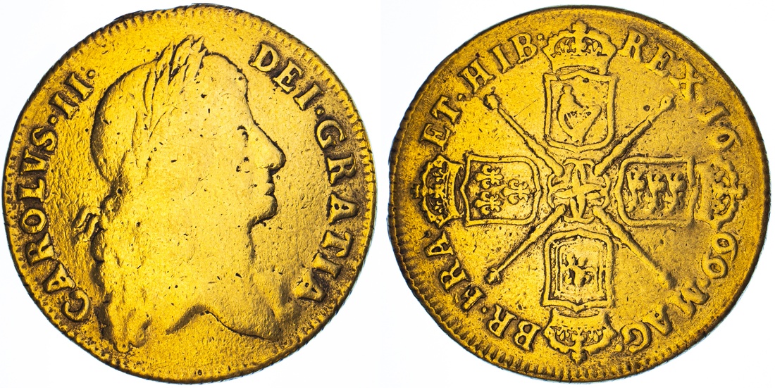 Charles II (1660-1685), Two-Guineas, 1669, first laureate head right, rev. stop after HIB, crowned shields cruciform, emblem-adorned sceptres in angles, eight strings to harp, edge obliquely milled, 6h (MCE 34; EGC 207 [R2]; Spink 3333), removed from a mount with resultant solder at 12 o'clock, the surfaces sweated and burnished, otherwise legible, struck details fair / bolder than fine, a recent discovery piece, OF THE HIGHEST RARITY