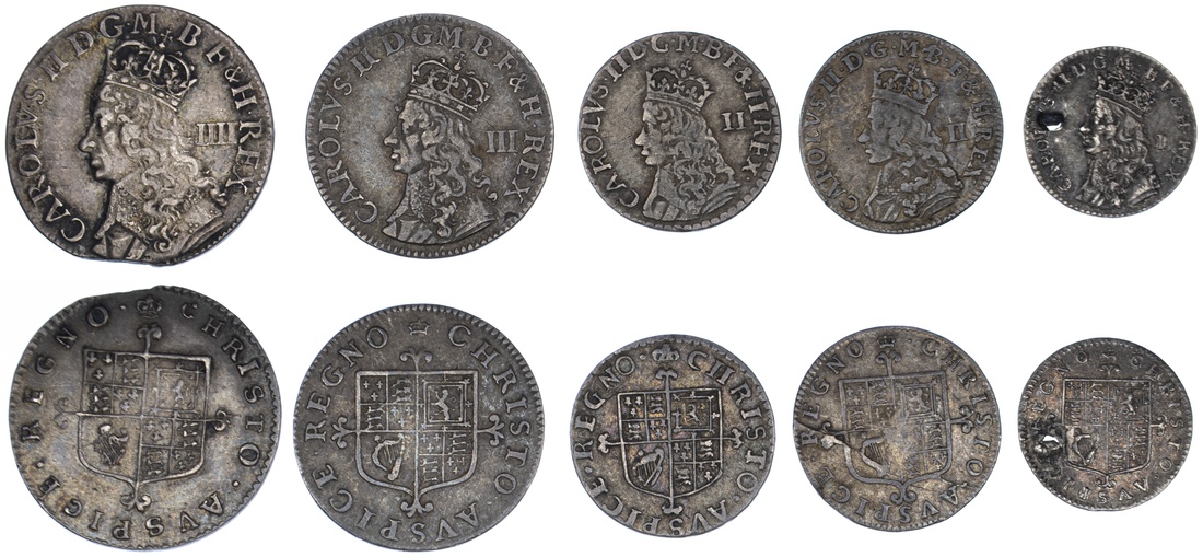 Charles II (1660-1685), Maundy Set, undated, crowned bust left, with falling lace collar, rev. square-topped shield over cross moline, edges plain, 6h, 1.96g; 6h, 1.55g; 6h, 0.98g; 6h, 0.52g (ESC 2365; Bull 590; Spink 3391), the Fourpence chipped to the edge, the Penny pierced, all with some rub to the higher points, very fine; another Twopence, undated, as before, plain edge, 0.98g, 6h (ESC 2169; Bull 588; Spink 3387), hairline die flaw to the reverse and flat to the portrait, fine (5)