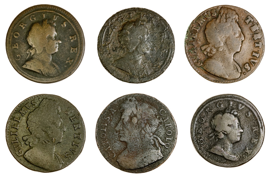 Charles II (1660-1685), Halfpenny, date illegible, laureate and cuirassed bust left, rev. Britannia seated left, plain edge, 9.84g, 6h (Spink 3393), corroded and scratched, fair; also William III (1694-1702), Halfpenny, date illegible, laureate bust right, rev. Britannia seated left, plain edge, 10.58g, 6h (Spink 3554-6), fair; and 1701, laureate bust right, rev. Britannia seated left, plain edge, 9.71g, 6h (Spink 3556), mostly flat to devices, fine; also George I (1714-1727), 'Dump' Issue, Halfpenny, 1717, laureate bust right, rev. Britannia seated left, plain edge, 8.29g, 6h (Spink 3659), worn and lightly corroded to the fields, fine; Second Issue, Halfpenny, 1720, laureate bust right, rev. Britannia seated left, plain edge, 9.63g, 6h (Spink 3660), worn and corroded to the fields, fine; 1723, laureate bust right, rev. Britannia seated left, plain edge, 8.45g (Spink 3660), rubbed, fine (6)