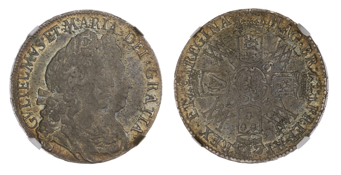 NGC AU50 | William and Mary (1688-1694), Halfcrown, 1693, QVINTO, second conjoined and draped busts right, rev. crowned cruciform shields, WM in angles, six strings to harp, downwards lettered edge, 6h, 14.93g (ESC -; Bull 860; Spink 3436), haymarked and with softness to the portraits, yet with tone and lustrous flare, mainly to the legends, good very fine, in NGC holder, graded AU50 (Cert. #3711954-002)