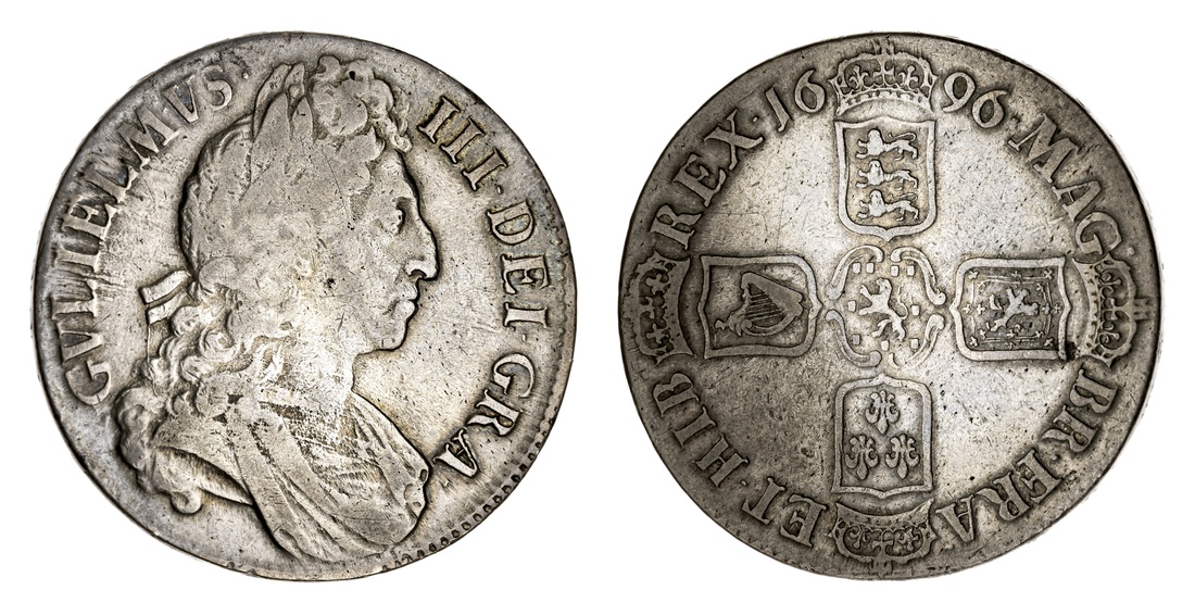 William III Solus (1694-1702), Crown, 1696 OCTAVO, third laureate and draped bust right, rev. crowned shields cruciform, eight strings to harp, edge lettered downwards, 29.34g, 5h (ESC 89; Bull 995; Spink 3472), previously cleaned and soft to the devices, nevertheless with areas of toning, near very fine