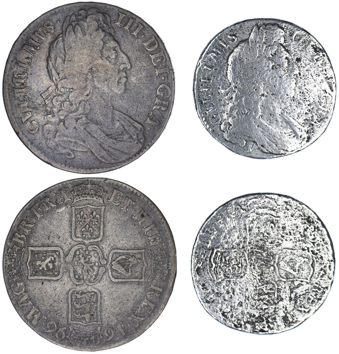 William III Solus (1694-1702), Crown, 1696 OCTAVO, third laureate and draped bust right, rev. crowned cruciform shields, seven strings to harp, downwards lettered edge, 6h, 29.70g (ESC 94; Bull 1004; Spink 3472), bagmarked and mostly flat to the devices, fine; Halfcrown, date illegible [1696 or 1697], laureate and draped bust right, rev. crowned large shields, with seven strings to early harp, 6h, 12.67g (Spink 3481), cleaned and with heavily pitted surfaces, likely from water erosion, fair (2)