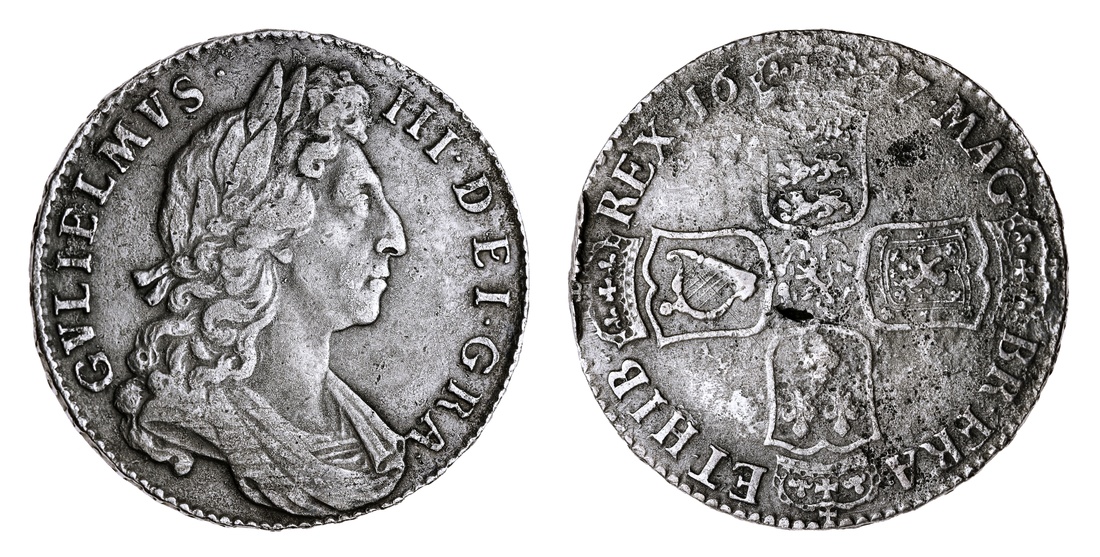 William III Solus (1694-1702), Halfcrown, 1697 NONO, laureate and draped bust right, rev. crowned cruciform shields, seven strings to late harp, downwards lettered edge, 14.41g, 6h (ESC 541; Bull 1021; Spink 3487), heavily pitted surfaces from water submersion, tooled to the edge at 9 o'clock, otherwise with a uniform grey tone, very fine / fine