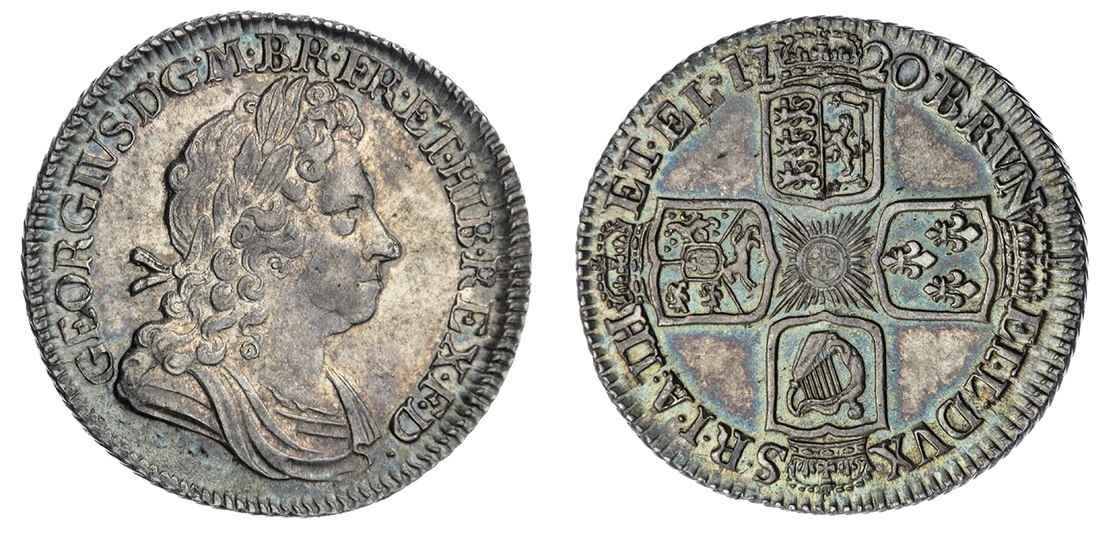 George I (1714-1727), Shilling, 1720, first laureate and draped bust right, rev. crowned shields cruciform, seven strings to harp, edge obliquely milled, 6.03g, 6h (ESC 1168; Bull 1572; Spink 3646), most pleasingly cabinet toned with much underlying lustre, good extremely fine