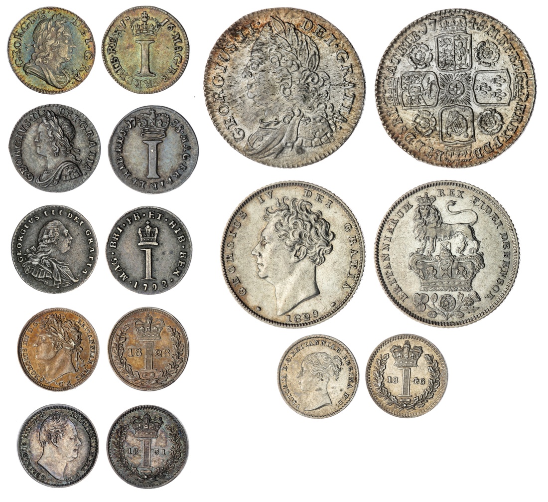 Various Milled Silver (8) | George I (1714-1727), Penny, 1716, laureate and draped bust right, rev. crowned denomination, plain edge, 0.57g, 6h (ESC 2323; Bull 1636; Spink 3657); also George II (1727-1760), 'Roses' Sixpence, 1745, old laureate, draped and cuirassed bust left, rev. crowned cruciform shields, roses in angles, obliquely milled edge, 3.01g, 6h (Bull 1753; ESC 1615; Spink 3709); and, Penny, 1758, plain edge, 0.49g, 6h (ESC 2350; Bull 1840; Spink 3715A); also, George III (1760-1820), 1792 'Wire Money' Penny, 0.47g, 6h (Bull 2299; ESC 2419; Spink 3760); also, George IV (1820-1830), Sixpence, 1829, Type 3, bare head left, rev. lion on crown, milled edge, 6h, 2.81g (Bull 2439; ESC 1666; Spink 3815); and, Penny, 1828, 0.46g, 6h (ESC 2432; Bull 2453; Spink 3816); also, William IV (1830-1837), Penny, 1831, 0.47g, 6h (ESC 2436; Bull 2547; Spink 3840); also, Victoria (1837-1901), Penny, 1846, 0.46g, 6h (Bull 3489; ESC 2456; Spink 3916), pleasant toning to majority, all very fine