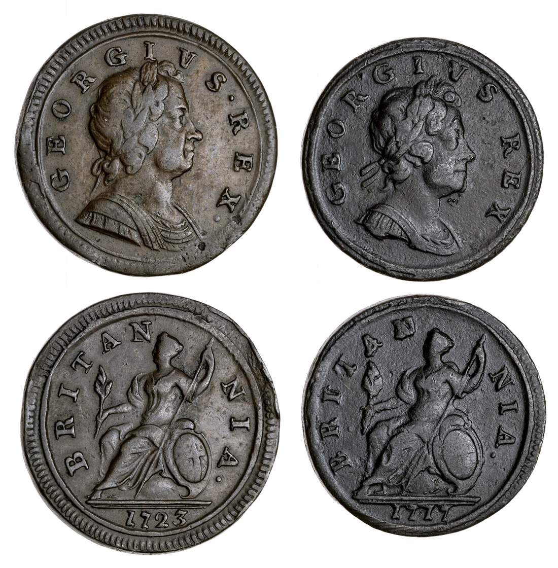 George I (1714-1727), 'Dump' Halfpenny, 1717, laureate and cuirassed bust right, rev. Britannia seated left, plain edge, 6h, 9.19g (Spink 3659), soft to the higher points and lacquered, very fine; Halfpenny, 1723, second laureate and cuirassed bust right, rev. Britannia seated left, plain edge, 6h, 8.92g (Spink 3660), soft to the devices, yet pleasing brown surfaces, good very fine (2)