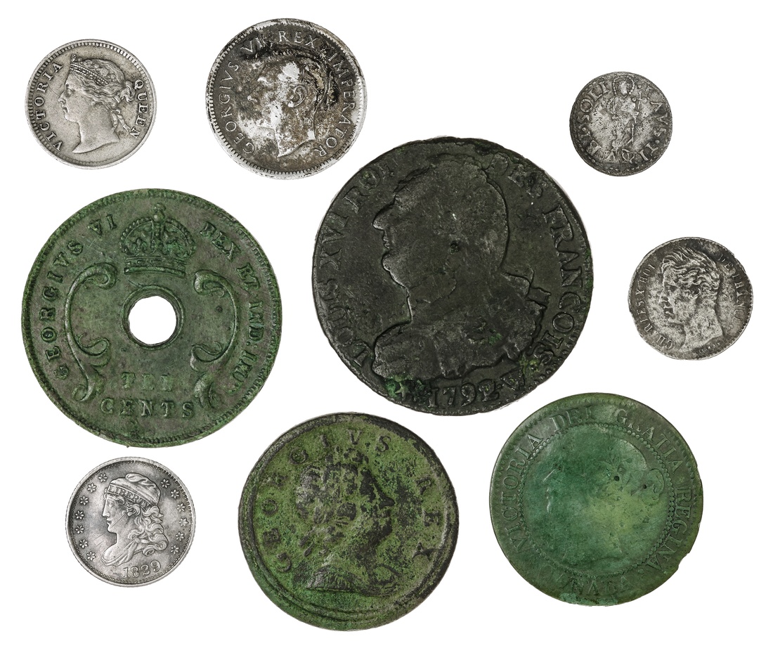 An Assortment of British and World Coins (9) | George I (1714-1727), 'Dump' Issue Halfpenny, 1717, no stops on obverse, 9.45g (Spink 3659), green patina, considerable weathering, fair; Italian States, Venice, Leonardo Loredan (1486-1538), Soldino/'Galleyhalfpen', c. 1501, Saint Mark standing right, presenting banner to Doge kneeling left, rev. Christ Pantokrator standing facing, S F below, 0.28g (CNI VII 13; Papadopoli 49; Paolucci 9), about fine, an intriguing example of a European coin taking unofficial value in England; France, Legislative Assembly (1791-1792) struck in the name of Louis XVI (1774-1792), 2 Sols (24 Deniers), 1792A, LOUIS XVI ROI - DES FRANCOIS, draped bust left, star before date-mark, rev. LA NATION LA - LOI LE ROI, fasci topped with Phrygian cap, between two oak branches, 2-S to either side, .L'AN 4 DE LA LIBERTÉ 1792, in exergue, 25.14g (Duplessy 1722), light verdigris, but otherwise fine to good fine; France, Bourbon Restoration, Charles X (1824-1820), Quarter Franc, 1829 A, Arras, CHARLES X ROI DE FRANCE, bare head left, date below, rev. Crowned coat of arms, denomination and mintmark across fields, wreath around, date below, 0.92g (Gadoury 450), spotted, about fine; USA, 'Liberty Cap' Half Dime, 1829, capped and draped bust left, stars surround, date below, rev. Eagle standing facing, head left, motto above, 1.35g (KM 47), lustrous, good fine or better; Canada, Victoria (1837-1901), Cent, 1859, young head left, rev. denomination and date within wreath, 3.44g (KM 1) green patina, slightly bent flan, fine; Straits Settlements, Victoria (1837-1901), Five Cents, 1887, 1.36g, fine; East Africa, George VI (1936-1952), 10 Cents, 10.00g, green patina, slight porosity, fine; South Africa, George VI (1936-1952), Sixpence, 1941, 2.77g, fine (9)