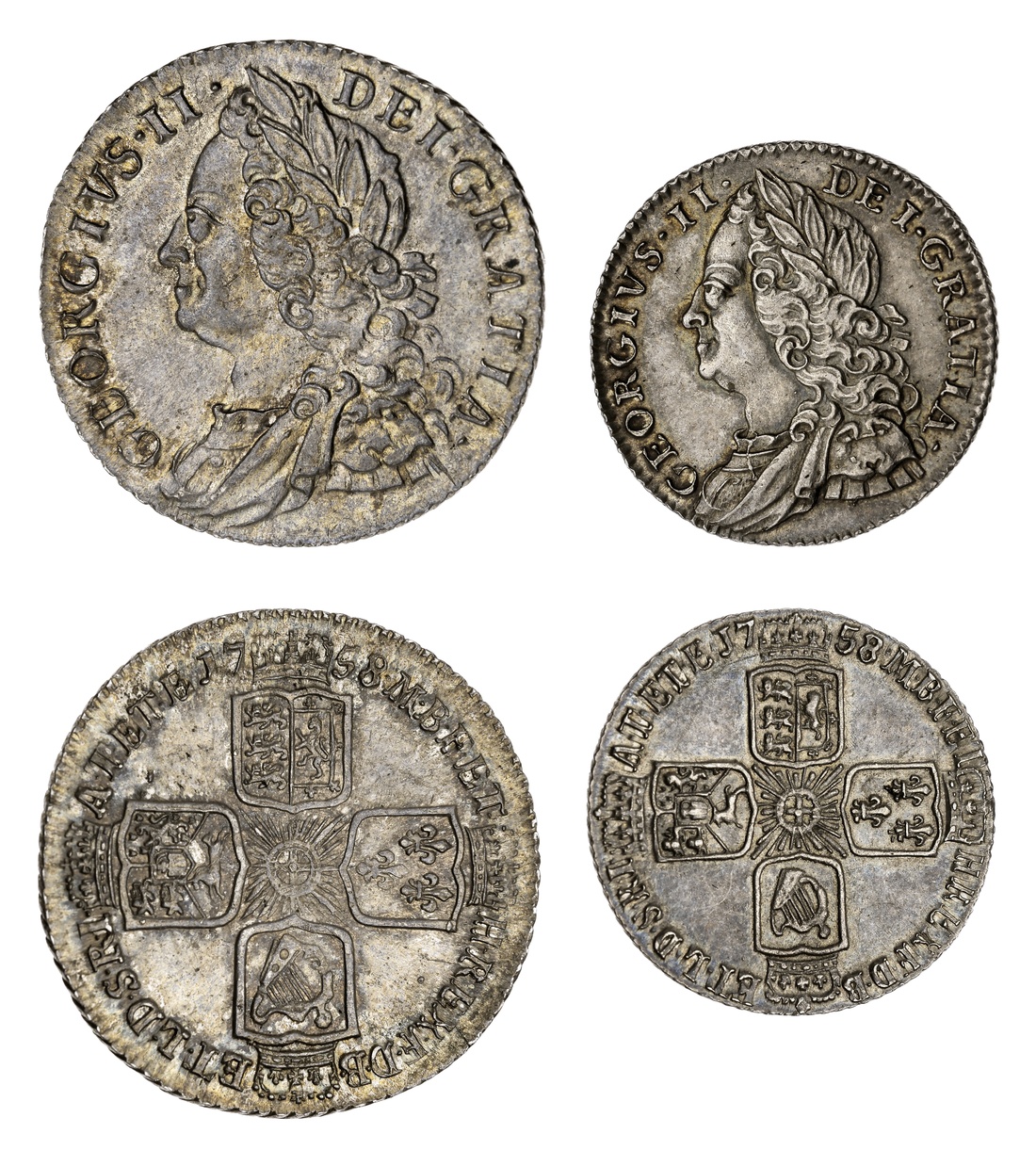 George II (1727-1760), 'Old Head' Shilling, 1758, old laureate, cuirassed and draped bust left, rev. crowned cruciform shields, eight strings to harp, obliquely milled edge, 6.00g, 6h (ESC 1213; Bull 1734; Spink 3704), some flecks to the reverse, with a most handsome old cabinet tone to lustrous fields, pleasing extremely fine; 'Old Head' Sixpence, 1758, old laureate, cuirassed and draped bust left, rev. crowned cruciform shields, five strings to harp, obliquely milled edge, 3.01g, 6h (ESC 1623; Bull 1763; Spink 3711), small raised area to the D of DEI and a slight softness to the hair, nevertheless with a rich old cabinet tone and lustre, extremely fine (2)