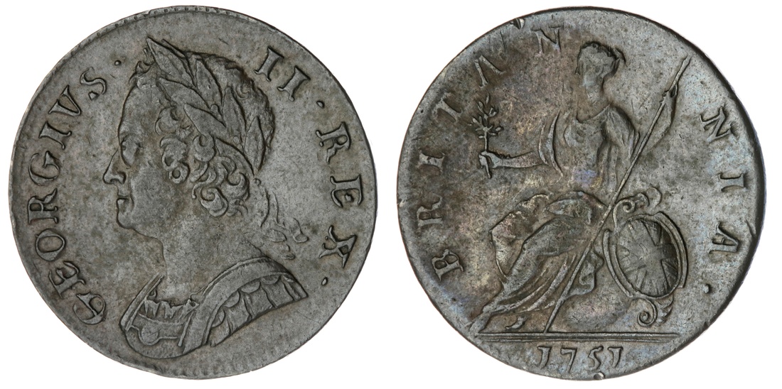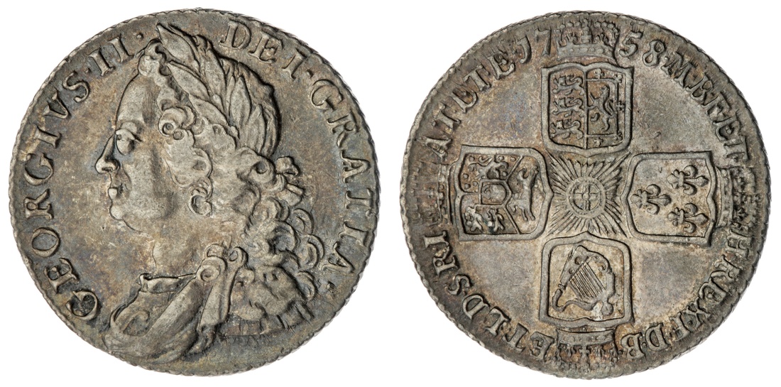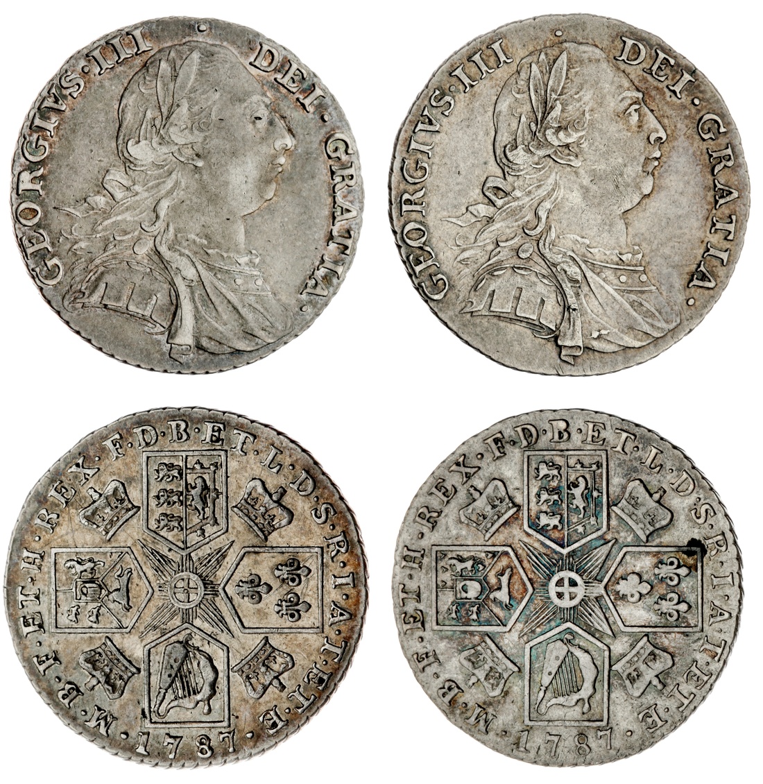 George II (1727-1760), 'Old Head' Shilling, 1758, old head left, rev. crowned cruciform shields, plain in angles, eight strings to harp, 6.01g, 5h (ESC 1213; Bull 1734; Spink 3704), rub to hair, otherwise toned and residually lustrous, good very fine; and Halfpenny, 1751, laureate bust left, rev. Britannia stead left, plain edge, 9.92g, 5h (Spink 3719), rub to high points, more so to the reverse, otherwise bolder very fine / very fine; also George III (1760-1820), Shilling, 1787, laureate, draped and cuirassed bust right, rev. crowned shields cruciform, six strings to harp, no hearts, obliquely milled edge, 5.99g, 6h (ESC 1216; Bull 2125; Spink 3743), previously wiped and with some hairlines, nevertheless now retoning, very fine, the reverse better; another, seven strings to harp, with semée of hearts, obliquely milled edge, 6.01g, 6h (ESC 1225; Bull 2129; Spink 3746), nailmark to eye and some rub to high points, otherwise toned in places, very fine; also Middlesex, Thomas Erskine, AE Political Halfpenny Token, 18th Century, HON. T. ERSKINE, draped bust left, rev. A FRIEND TO FREEDOM & RIGHTS OF MAN., 29mm, 8.01g (D&H 1010 - Middlesex), some light contact marks and carbonised marks, otherwise very fine (5)