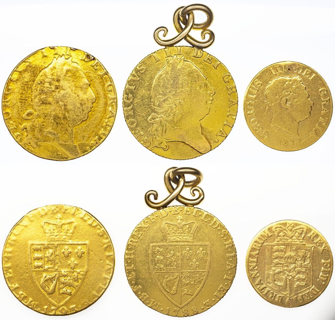 (g) Trio of Georgian Gold | George III (1760-1820) 'Spade' Guinea, 1788, laureate bust right, rev. crowned 'spade' shield, obliquely milled edge, 9.75g, 12h (ECG 713; MCE 392; Spink 3729), mounted for suspension, lightly sweated surfaces and scratched across the truncation, yet bolder fine / about very fine; 'Spade' Guinea, 1793, laureate bust right, rev. crowned 'spade' shield, obliquely milled edge, 8.23g, 12h (ECG 723; MCE 397; Spink 3729), previously mounted, and residue upon heavily sweated surfaces, good to fair; 'New Coinage' Half-Sovereign, 1817, laureate head right, rev. crowned shield, milled edge, 3.77g, 6h (Bull 928; Spink 3786), previously mounted and with heavily sweated surfaces, fair (3)