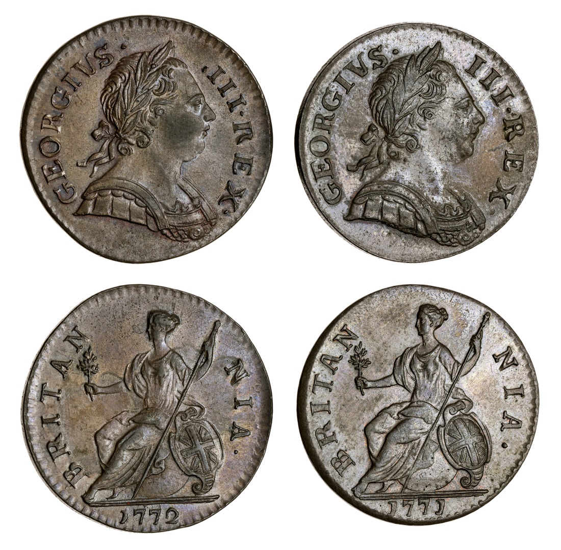 George III (1760-1820), First Issue, Halfpenny, 1771, young laureate and cuirassed bust right, rev. Britannia seated left, plain edge, 9.81g, 7h (BMC [Peck] 896; Spink 3774), with a glossy glass-like lustre to toned and brown surfaces, handsome extremely fine; and First Issue, Halfpenny, 1772, young laureate and cuirassed bust left, rev. Britannia seated left, plain edge, 10.32g, 6h (BMC [Peck] 901; Spink 3774), with a glossy glass-like lustre to toned and brown surfaces, handsome extremely fine (2)