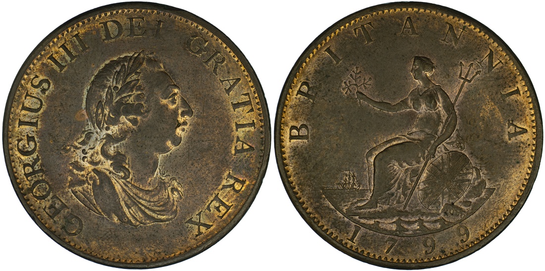 George III (1760-1820), Halfpenny, 1799, Soho, laureate and draped bust right, rev. Britannia seated left, five incuse gunports, centre milled edge, 13.07g, 6h (BMC [Peck] 1248; Spink 3778), a handsome lustrous flare and with hints of mint red under brown surfaces, extremely fine