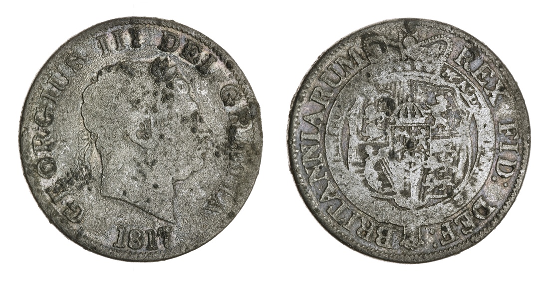 George III (1760-1820), Contemporary Counterfeit 'New Coinage' Halfcrown, 1817, laureate head right, rev. crowned shield in Garter, milled edge, 9.91g, 12h (cf. ESC 616; cf. Bull 2090; cf. Spink 3788), contemporary forgery struck from unofficial dies, worn to the surfaces and mostly flat, fine, nonetheless an intriguing historical numismatic curio