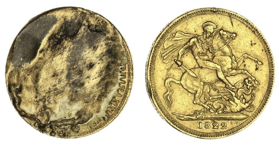 (g) George IV (1820-1830), Sovereign, 1822, Type 1, obverse defaced with solder, rev. St. George and Dragon, date in exergue, edge milled, 7.98g*, 7h (Marsh 6; Spink 3800), the obverse entirely defaced by solder, presumably for mounting in a brooch, the reverse pockmarked from soil deposition, otherwise struck details very fine, an interesting piece of social history