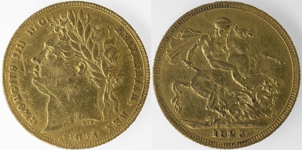 (g) George IV (1820-1830), Sovereign, 1823, Type I, laureate head left, rev. St George and Dragon, edge milled, 7.93g, 6h (Marsh 7; MCE 473; Stratos -; Spink 3800), a field find and thus with resultant scratches and stippling, otherwise faintly residually lustrous, struck details very fine, the key date in series