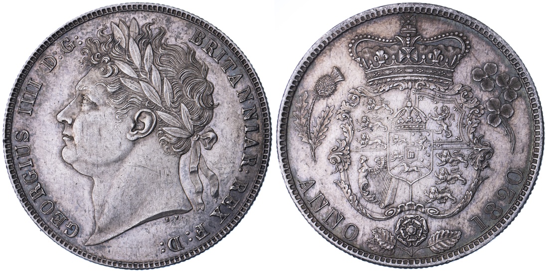 (x) George IV (1820-1830), Halfcrown, 1820, Type 1, laureate head left, rev. crowned and lightly garnished shield, milled edge, 6h, 14.08g (ESC 628; Bull 2357; Spink 3807), traces of contact marking to the truncation, otherwise with full detail to the hair, the fields near brilliant, about uncirculated