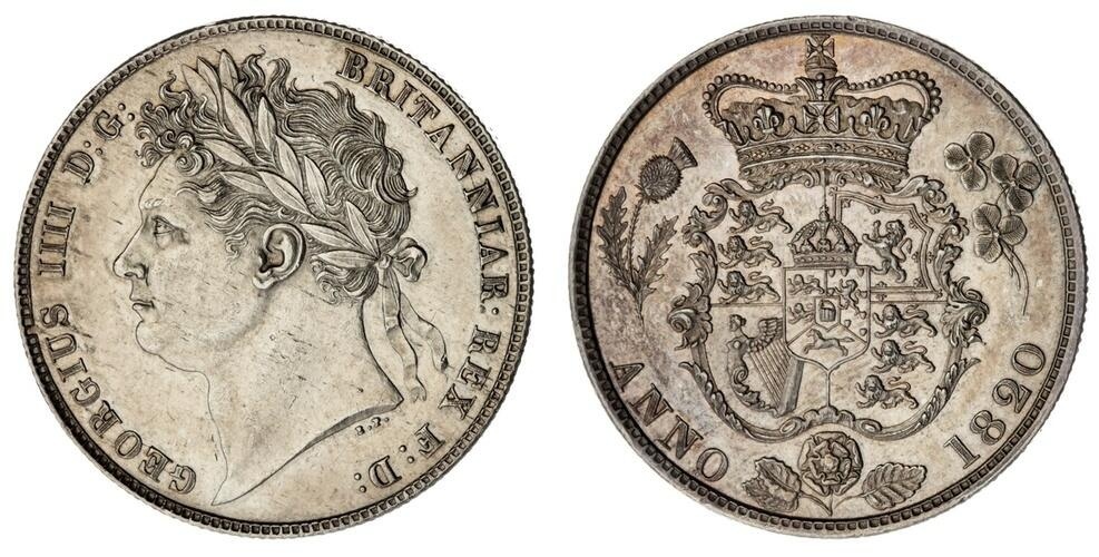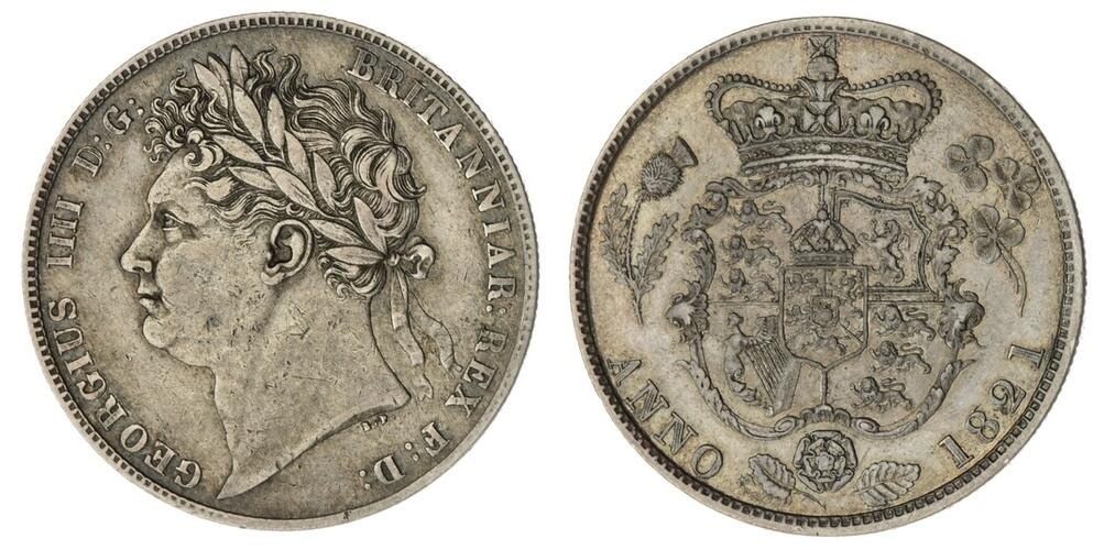 George IV (1820-1830), Halfcrown, 1820, Type 1, laureate bust right, rev. lightly garnished shield, milled edge, 6h, 14.10g (ESC 628; Bull 2357; Spink 3807), the obverse cleaned and lightly contact marked, yet the reverse with a proof-like flashy lustre and attractive toning, very fine / extremely fine; Halfcrown, 1821, Type 1, laureate head right, rev. lightly garnished shield, milled edge, 6h, 14.00g (ESC 631; Bull 2360; Spink 3807), wiped and lightly bagmarked, yet some toning to the reverse, very fine, reverse better (2)