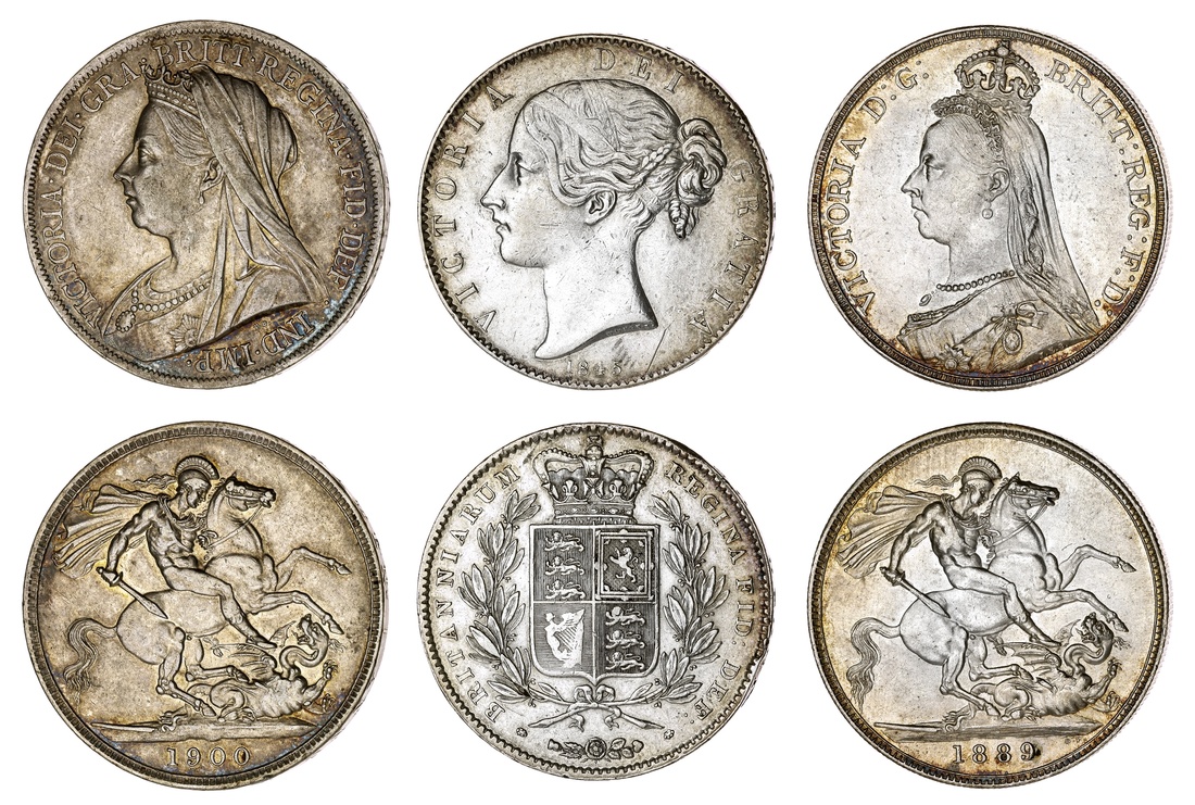 Victoria (1837-1901), Crowns (3), 'Young Head' Crown, 1845 VIII, cinquefoil stops, head left, rev. crowned shield in wreath, incuse upwards lettered edge, 28.17g, 6h (ESC 282; Bull 2564; Spink 3882), cleaned and bagmarked, bolder fine; 'Golden Jubilee' Crown, 1889, crowned 'Jubilee' bust left, rev. St George and Dragon, milled edge, 28.30g, 12h (ESC 299; Bull 2589; Spink 3921), lightly contact, otherwise toned and with a still mostly pleasing lustre, more so to the reverse, good very fine; lastly, 'Old Head' Crown, 1900 LXIII, veiled bust left, rev. St George and Dragon, upwards lettered edge, 28.30g, 12h (ESC 319; Bull 2609; Spink 3937), wiped and contact marked, yet with flashes of toning to the edges of devices and the legends, very fine (3)