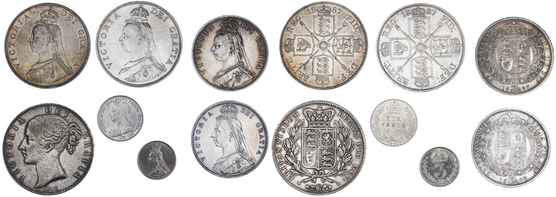 Golden-Jubilee Silver (7) | Victoria (1837-1901), 'Young Head' Crown, 1845 VIII, cinquefoil stops, 6h, 28.14g (ESC 282; Bull 2564; Spink 3882), polished and lightly bagmarked, bolder fine; 'Golden Jubilee' Double-Florin, 1887 (2), Roman 1, milled edge, 22.57g, 12h; milled edge, 22.58g, 12h (ESC 394; Bull 2695; Spink 3922), the first bagmarked and wiped, yet with a residual lustre, very fine, the second some light contact marking, nevertheless with a handsome cartwheel lustre, extremely fine; 'Golden Jubilee' Halfcrown, 1887 (2), milled edge, 14.12g, 12h; milled edge, 14.10g, 12h (ESC 719; Bull 2771; Spink 3924), both lightly contact marked, the first wiped, yet both with a residual lustre, very fine; 'Old Head' Sixpence, 1901, milled edge, 2.82g, 12h (ESC 1771; Bull 3294; Spink 3941), bright, yet some lustre in legends, very fine; 'Golden Jubilee' Threepence, 1887, plain edge, 1.40g, 12h (ESC 2096; Bull 3436; Spink 3931), hairlined to the fields and bright, yet some lustre, very fine (7)