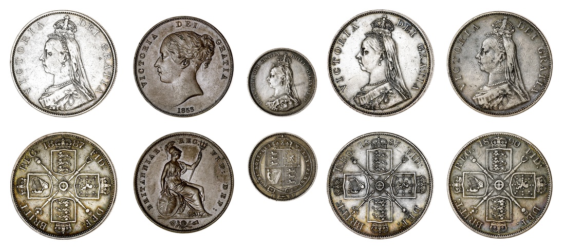 Victoria (1837-1901), 'Golden Jubilee' Double-Florin, 1887, Roman I; 1887, Arabic 1; 1890, Jubilee bust left, rev. crowned cruciform shields, sceptres in angles, milled edges, 12h, 22.42g; 12h, 22.59g; 12h, 22.43g (ESC 394; 395; 399; Bull 2695; 2697; 2703; Spink 3922; 3923), the first and last rubbed and bagmarked, about very fine, the second with some contact marks, yet with a pleasing blue tone, good very fine; 'Golden Jubilee; Shilling, 1887, Jubilee bust left, rev. crowned shield in Garter, milled edge, 12h, 5.64g (ESC 1351; Bull 3137; Spink 3926), hairlined and wiped, yet toned, very fine; Penny, 1858 over 7 OT, young bust left, W.W. incuse on truncation, rev. Britannia seated right, plain edge, 12h, 19.02g (Peck [BMC] 1517; Spink 3948), with handsome brown surfaces, extremely fine (6)