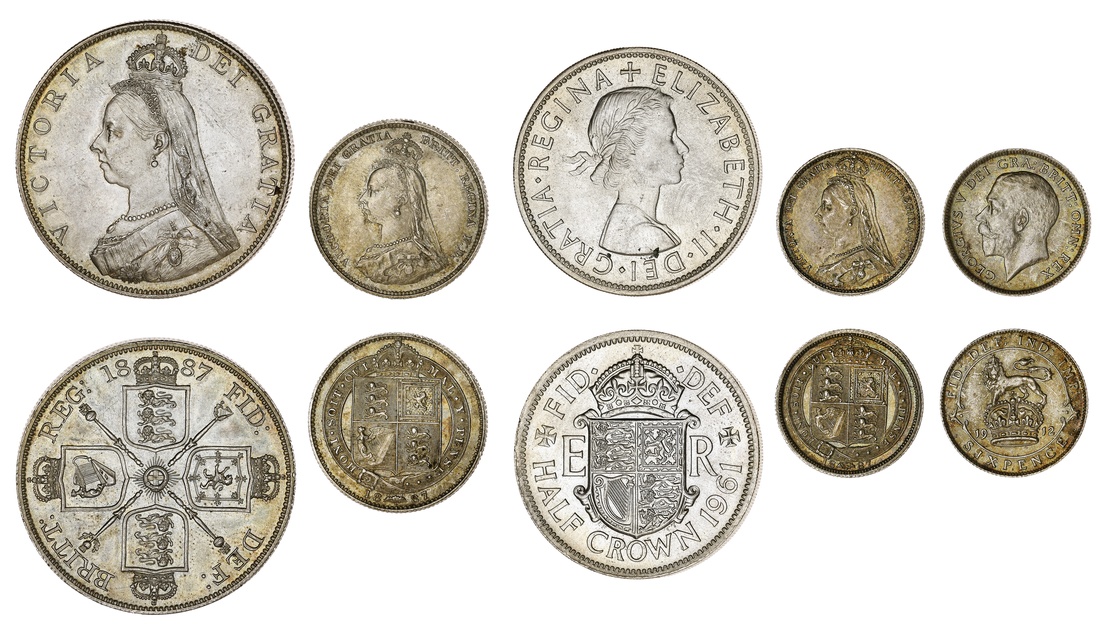 Mixed Milled Silver (5) | Victoria (1837-1901), 'Golden Jubilee' Double-Florin, Arabic 1, 1887, crowned Jubilee bust left, rev. crowned shields in cruciform, sceptres in angles, 22.57g, 12h (ESC 395; Bull 2697; Spink 3923), pinmarking to the obverse field, otherwise with a full glossy lustre to lightly toned surfaces, good extremely fine; and 'Golden Jubilee' Shilling, 1887, crowned Jubilee bust left rev. crowned shield in Garter, milled edge, 5.66g, 12h (ESC 1351; Bull 3137; Spink 3926), a couple of surface marks, otherwise toned and lustrous, extremely fine; 'Withdrawn' Sixpence, 1887, crowned Jubilee bust left rev. crowned shield in Garter, milled edge, 12h, 2.81g (ESC 1751; Bull 3264; Spink 3928), touch of softness to the very tops of the hair, yet toned and lustrous in the fields, extremely fine; George V (1910-1936), Sixpence, 1912, bare head left, rev. lion atop crown, milled edge, 12h, 2.83g (ESC 1797; Bull 3873; Spink 4014), a handsome yellow and green tone and a fully lustrous fields, uncirculated; Elizabeth II (1952-2022), Halfcrown, 1961, laureate head right, rev. crowned shield, dividing E-R, milled edge, 12h, 14.15g (ESC 798p; Bull 4375; Spink 4145), small scuff in the obverse field, otherwise with a full mint lustre, uncirculated (5)