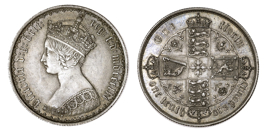 Victoria (1837-1901), 'Gothic' Florin, MDCCCLVI [1856], Type B¹, Gothic bust left, rev. crowned shields cruciform, emblems in angles, edge milled, 11.31g, 6h, (ESC 813A; Bull 2833; Spink 3891), wiped and lightly bagmarked to the obverse, otherwise the reverse with a brilliance and blue toning to dark grey surfaces, very fine / extremely fine