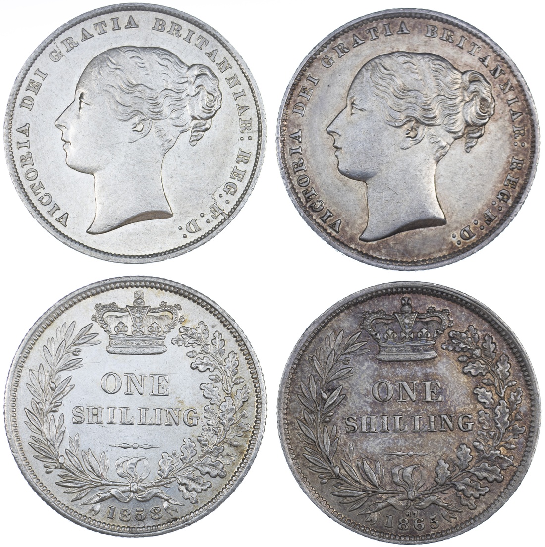(x) Victoria (1837-1901), 'Young Head' Shilling, 1858, Type A3, second young head left, plain on truncation, rev. crowned value in wreath, edge milled, 5.67g, 6h (Bull 3011; ESC 1306; Spink 3904), lightly wiped, otherwise fully lustrous, almost extremely fine; 'Young Head' Shilling, 1865 [die number 67], Type A4, second young head left, rev. crowned denomination within wreath, milled edge, 7h, 5.69g (ESC 1313; Bull 3025; Spink 3905), the obverse wiped, yet now retoning, the reverse with a flashy lustre and toned, very fine / extremely fine (2)