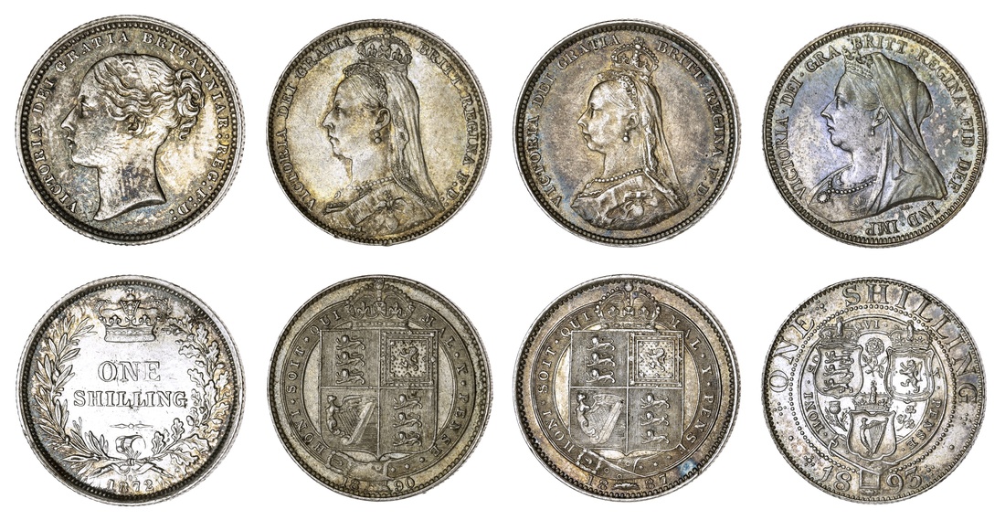 Victoria (1837-1901), Shillings (4), 'Young Head' Shilling, 1872 [Die 98], third young head left, rev. crowned denomination within wreath, milled edge, 6h, 5.63g (ESC 1324; Bull 3042; Spink 3906A), cleaned, yet now with a dark tone to the obverse, very fine; 'Golden Jubilee' Shilling, 1887, small Jubilee bust left, rev. crowned shield within Garter, edge milled, 5.65g, 12h (ESC 1351; Bull 3137; Spink 3926), rub to the higher points, nonetheless toned and with a residual lustre, very fine, the reverse better; 'Golden Jubilee' Shilling, 1890 'Narrow Date', larger 'Jubilee' bust left, rev. crowned shield in Garter, edge milled, 5.65g, 12h (Bull 3144; ESC 1357; Spink 3927), touch of softness to the higher points of the devices, yet with a uniformly warm-grey tone, very fine; 'Old Head' Shilling, 1893, veiled head left, large lettering, rev. small rose, crowned shields in Garter, edge milled, 5.64g, 12h (Bull 3153; ESC 1361; Spink 3940), faintest of pinmarking to the darkly toned fields of the obverse, nonetheless lustrous, handsomely so to the reverse, very fine / extremely fine (4)