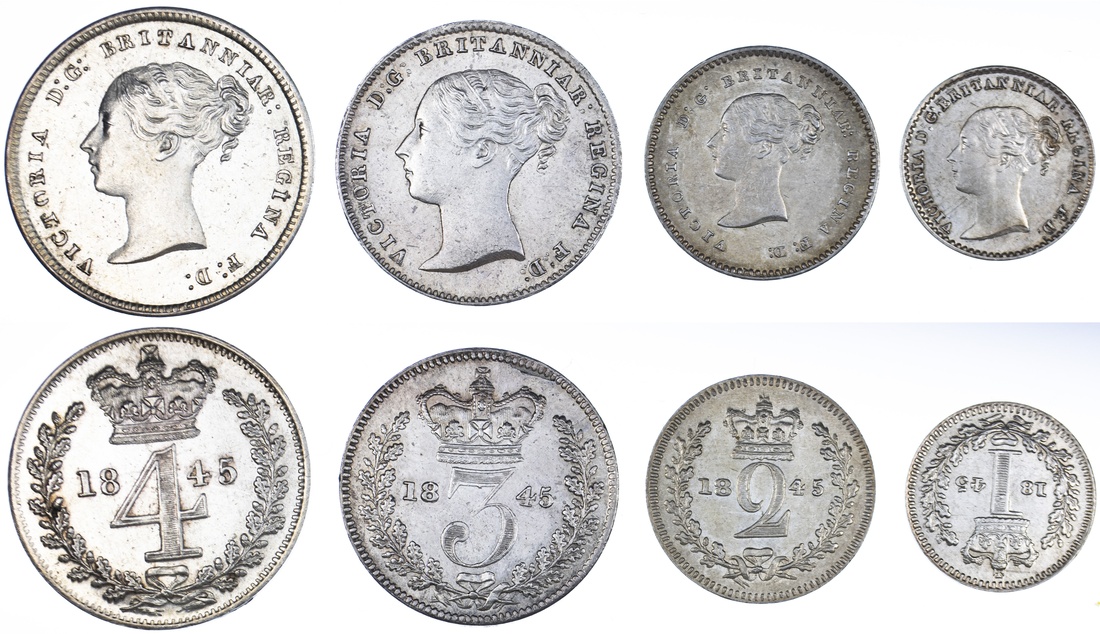 (x) Victoria (1837-1901), 'Young Head' Maundy Set, 1845, young head left, rev. crowned mark of value, edge plain (Bull 3488; ESC 2455; Spink 3916), bright and with some faint contact marking, otherwise with a residual lustre, nearing extremely fine, in case (4)
