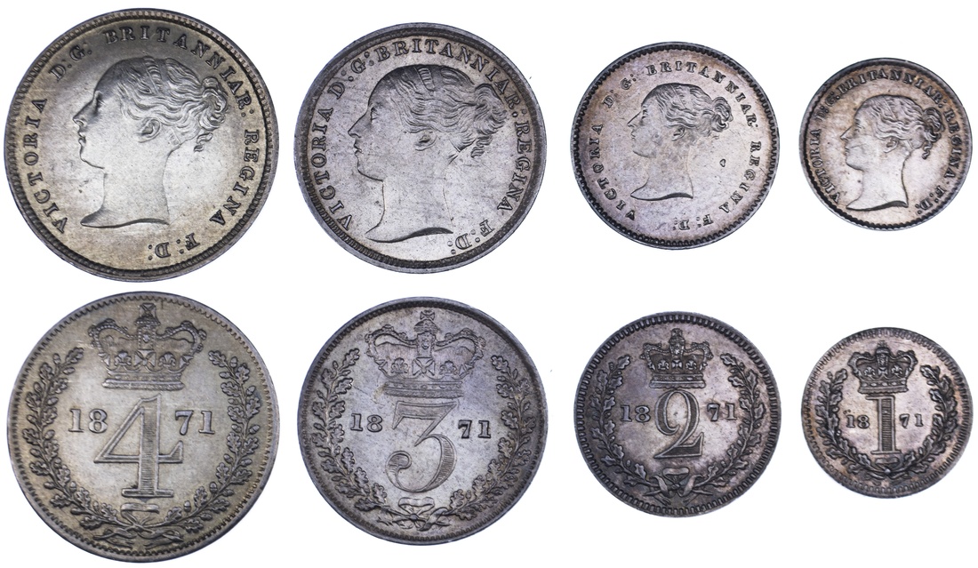 (x) Victoria (1837-1901), 'Young Head' Maundy Set, 1871, young head left, rev. crowned mark of value, edges plain (Bull 3523; ESC 2483; Spink 3916), the Fourpence wiped, all with some minor friction marks, otherwise with a glossy lustre, extremely fine (4)