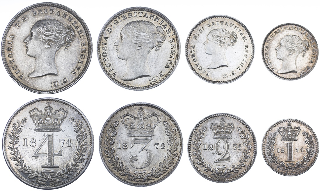 (x) Victoria (1837-1901), 'Young Head' Maundy Set, 1874, young head left, rev. crowned mark of value, edges plain (Bull 3527; ESC 2487; Spink 3916), evidence of previous handling, otherwise with near brilliant fields, uncirculated (4)